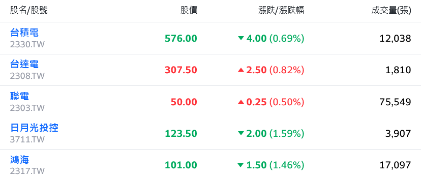 台積電軟腳下跌近0.7%至576元,鴻海、日月光投控走弱跌幅逾1%,聯電、聯發科、台達電小漲撐盤。光電類股走高1%,成為多頭指標,揚明光、華晶科、正達亮燈漲停,其中正達、華晶科更同創逾1年新高。