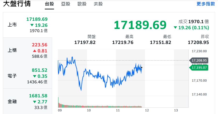 台股週一(20)震盪回檔,盤面個股輪動快速,上週強勢的觀光類股今日全面拉回,改由部分網通、消費性電子接力攻勢。台股盤中在平盤下整理,指數來到17194點,預估成交量約2800億元。新台幣兌美元維持強勢,盤中強升達1.64角,最高觸及31.692元關卡。