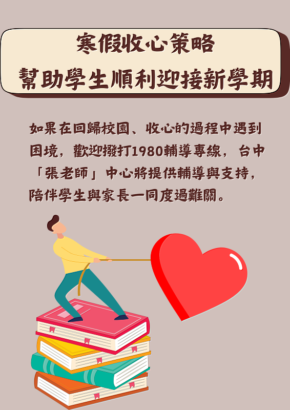 四、尋求專業協助,強化心理支持:若學生在開學後持續感到焦慮、沮喪或無法適應,建議家長與教師尋求專業協助,避免問題持續惡化。 1、主動尋求輔導服務:家長與學生可透過台中「張老師」中心1980輔導專線尋求心理支持與諮詢服務。 2、建立支持系統:協助學生尋找同儕、教師或輔導人員作為支持對象,讓他們在面對困難時能獲得適時的協助。 3、參與團體活動:透過社團及課後活動,學生可以逐步適應校園生活,增強歸屬感與人際連結。