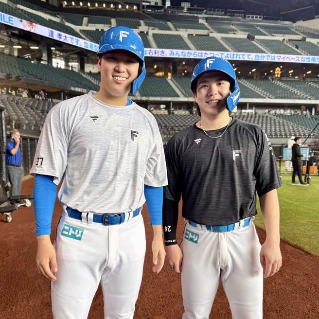 火腿隊古林睿煬(左)與金村尚真(右)為備戰交流賽,開始打擊練習。(圖/取自火腿隊官方X)